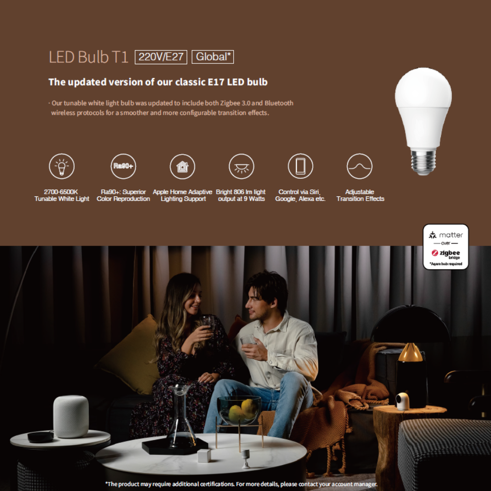 The Aqara LED Light Bulb T1 is a smart, energy-efficient E27 bulb that offers adjustable brightness and tunable white color temperatures. As a Zigbee 3.0 device, it is designed to work with an Aqara hub, providing seamless integration with various smart home platforms and automations.