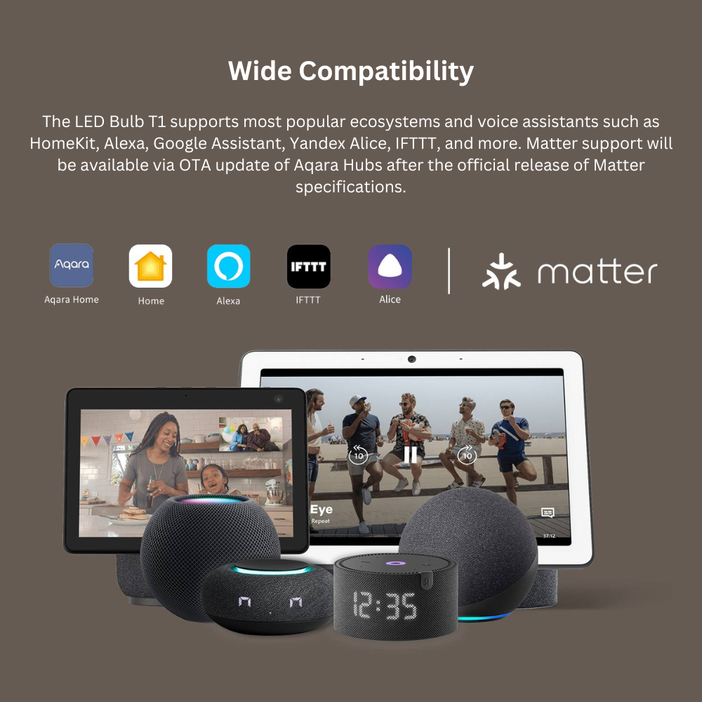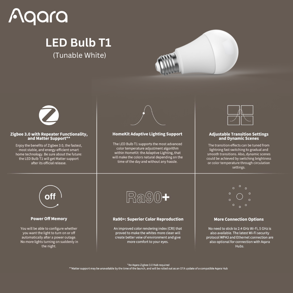 The Aqara LED Light Bulb T1 is a smart, energy-efficient E27 bulb that offers adjustable brightness and tunable white color temperatures. As a Zigbee 3.0 device, it is designed to work with an Aqara hub, providing seamless integration with various smart home platforms and automations.