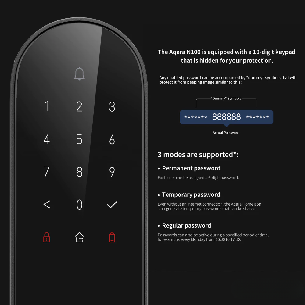 - Passcodes: Supports permanent and one-time passcodes with an anti-peep feature allowing dummy digits for added privacy.
