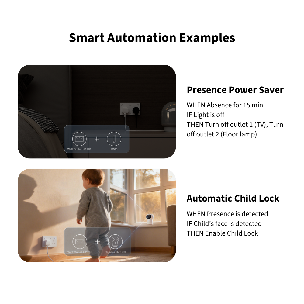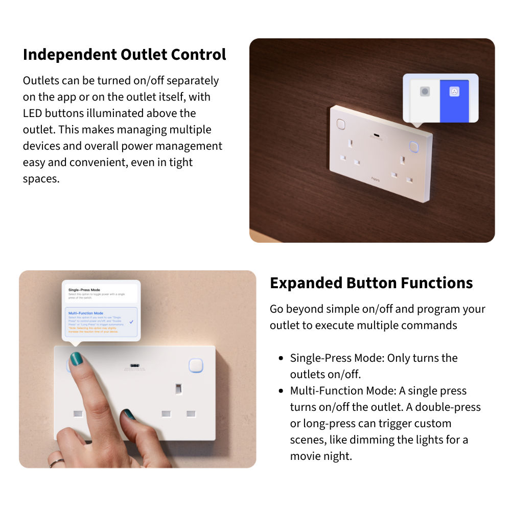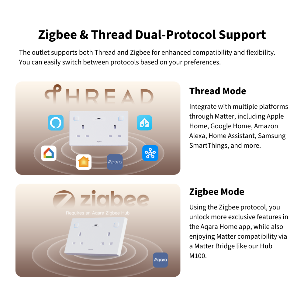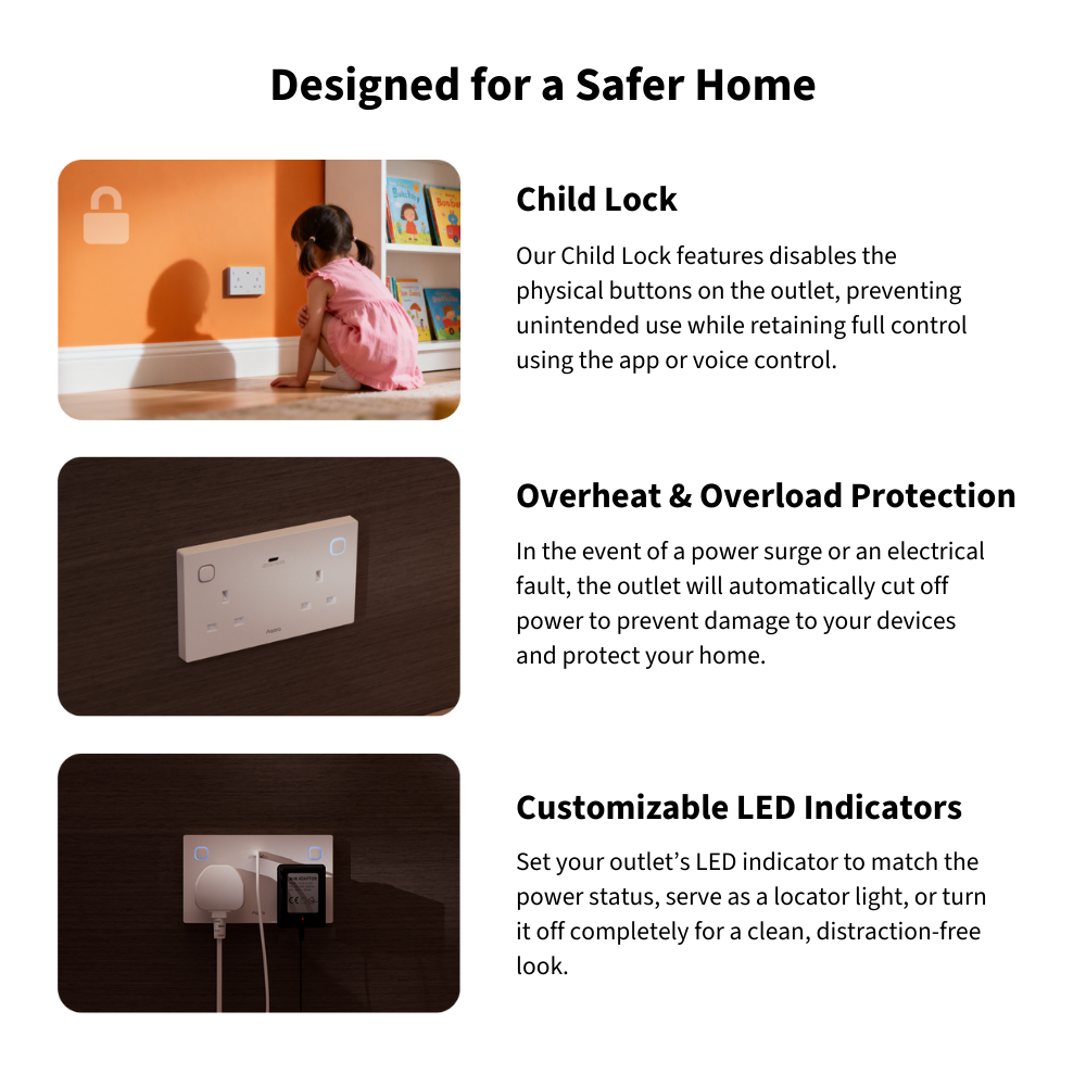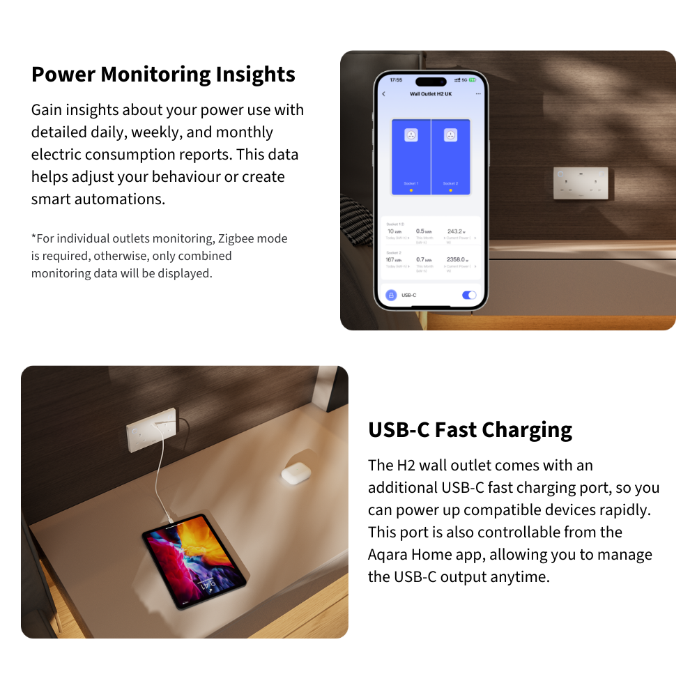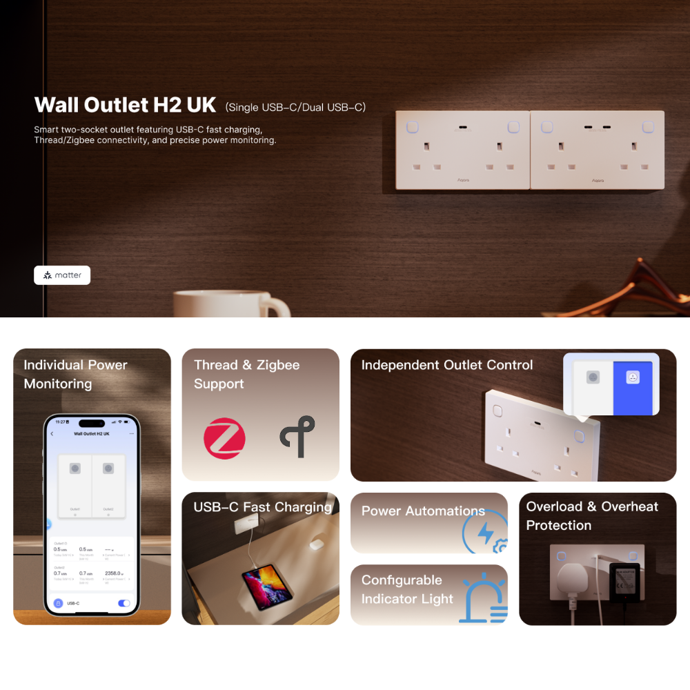 The Aqara Wall Outlet H2 UK brings smart, safe, and efficient power control to your home. With dual Thread and Zigbee support, it connects easily to Matter ecosystems or Aqara ecosystems. Enjoy independent outlet control, USB-C fast charging, and real-time power monitoring for smarter energy use. Built-in child lock, overload, and heat protection ensure safety and peace of mind — all in one elegant, intelligent outlet.